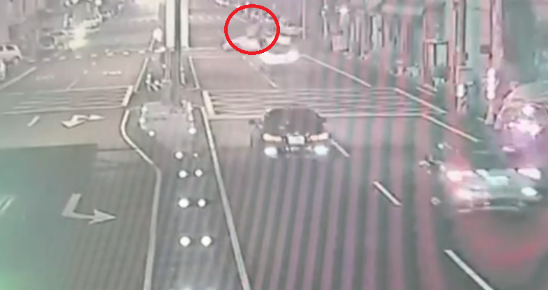 機車騎士被自小客車撞飛(紅圈處)。翻攝畫面